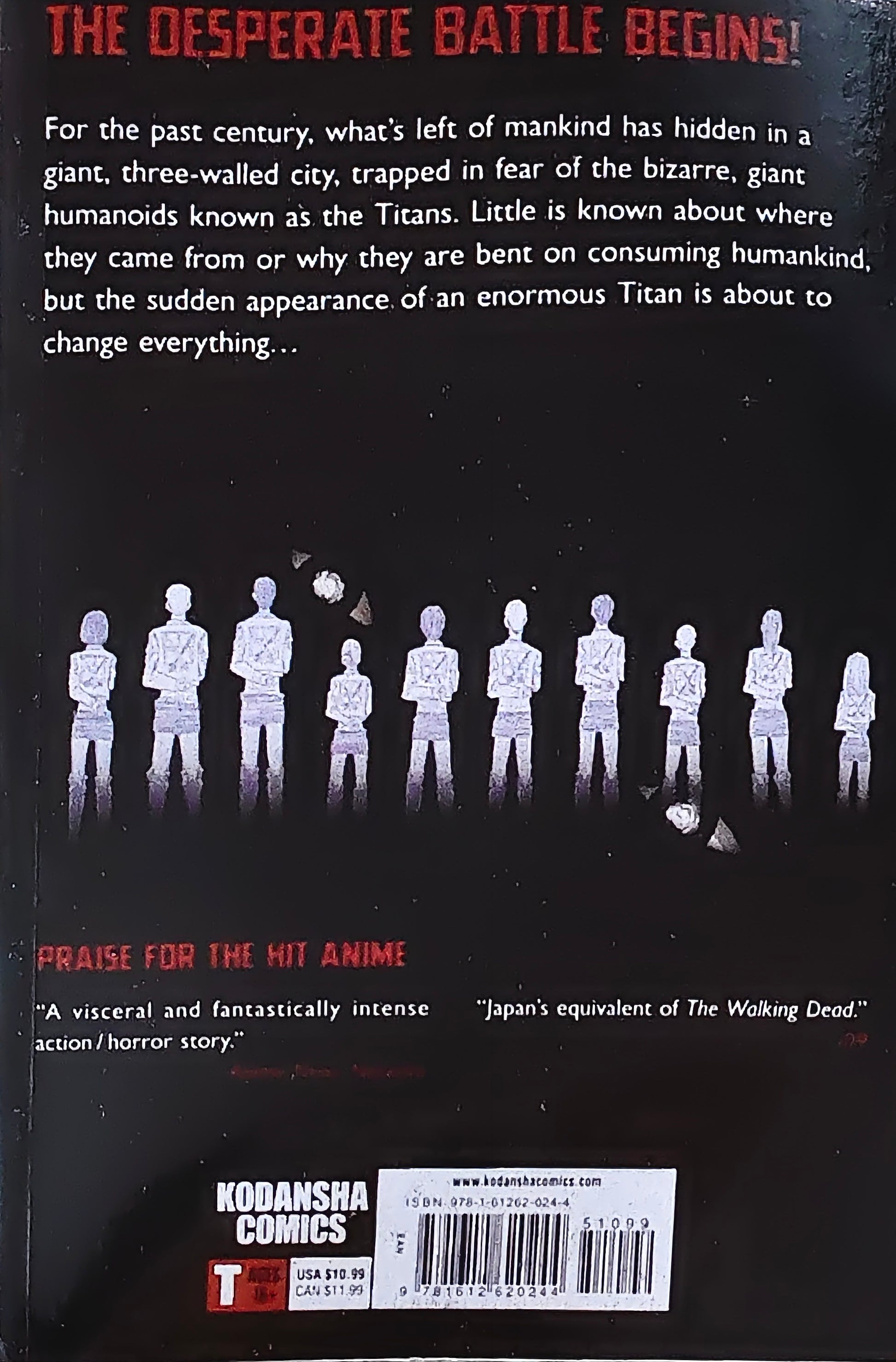 In this post-apocalyptic sci-fi story, humanity has been devastated by the bizarre, giant humanoids known as the Titans. Little is known about where they came from or why they are bent on consuming mankind. Seemingly unintelligent, they have roamed the world for years, killing everyone they see. For the past century, what's left of man has hidden in a giant, three-walled city. People believe their 50-meter-high walls will protect them from the Titans, but the sudden appearance of an immense Titan is about to change everything.
